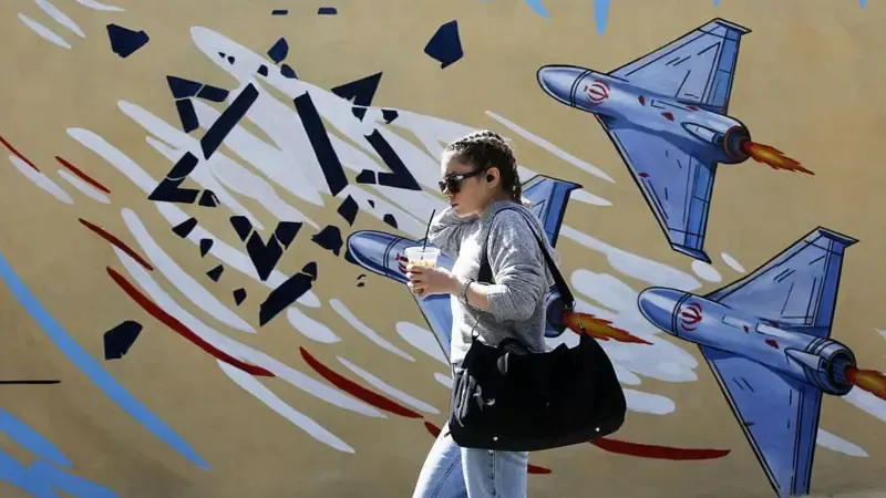 یک شهروند ایرانی در حال عبور از کنار نقاشی دیواری با موضوع حملات پهپادی ایران به اسرائیل