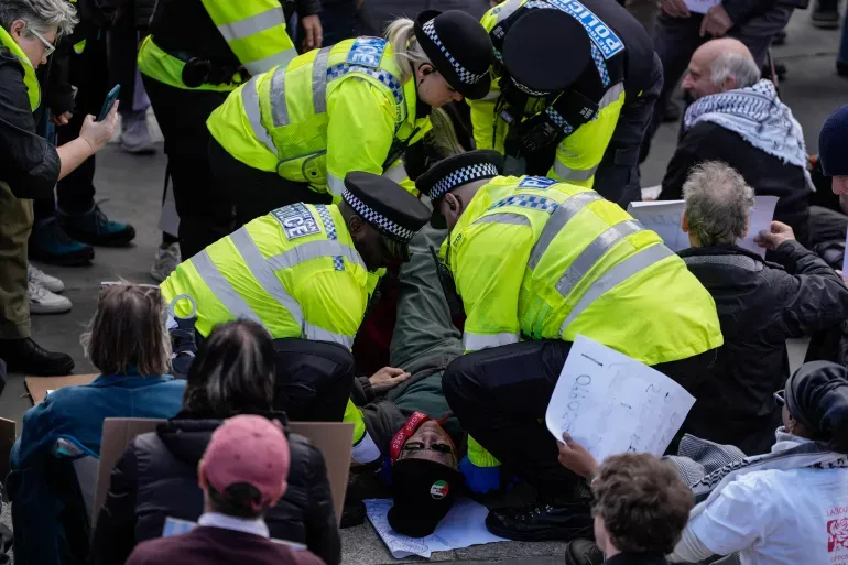مقابله پلیس انگلیس با تجمع یک گروه حامی فلسطین در لندن. فعالیت این گروه قبلا ممنوع شده بود.
